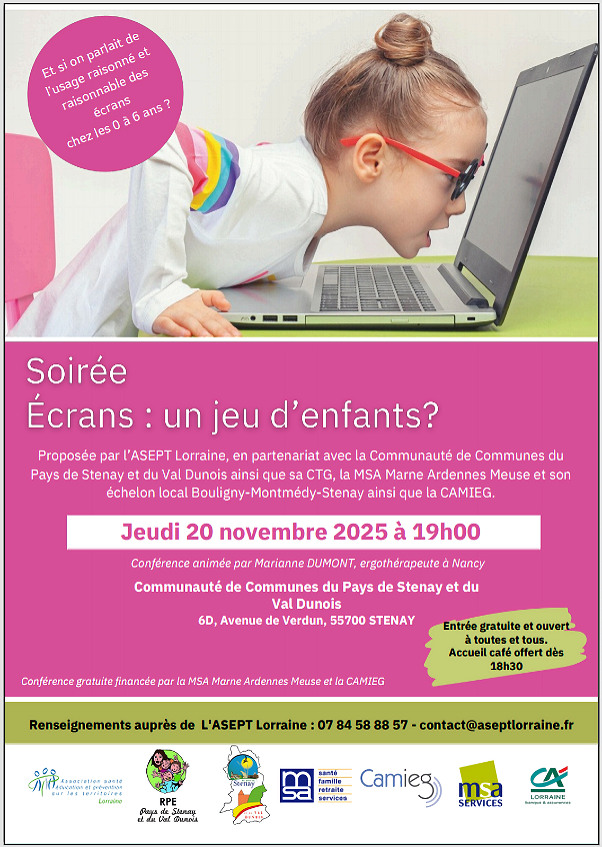 Aussi, l’Association de Santé, d’Education et de Prévention sur les Territoires de Lorraine (ASEPT Lorraine) en partenariat avec la Communauté de Communes du Pays de Stenay et du Val Dunois ainsi que sa CTG, la MSA Marne Ardennes Meuse et son échelon local Bouligny-Montmédy-Stenay et la CAMIEG vous propose une conférence de 2h00, intitulée « Ecrans : un jeu d’enfants ? »