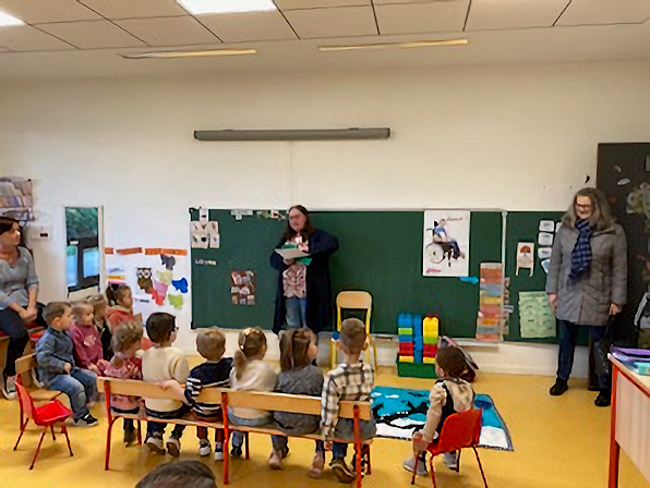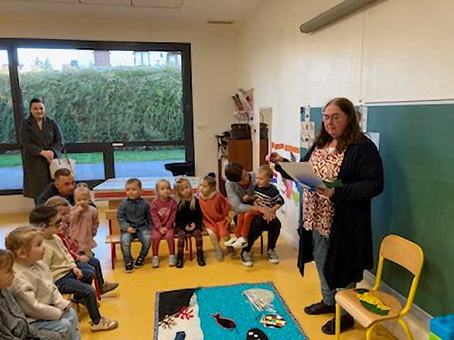 A l’initiative de Mme RITTER coordinatrice REP et Mme BEGUINET directrice de l’école maternelle « Les COURLIS » , Vendredi 7 Novembre les enfants nés en 2023 accompagnés de leurs parents ainsi que des parents d’enfants déjà scolarisés ont été invités à vivre un moment de partage et d’échanges dans la classe de petite section. Cinq familles avec leur enfant étant en âge d’être scolarisé et cinq parents dont les enfants ont déjà fait leur rentrée en septembre ont pu écouter un conte imaginaire « Bulle, petit poisson apprend à parler » grâce à l’intervention de Mme DOMINIQUE.
