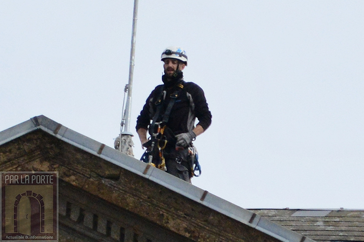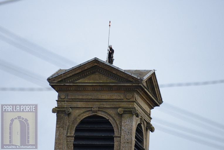 L'opération a été menée par un cordiste de la société Protibat. Équipé selon les normes de sécurité en vigueur pour les travaux en hauteur, le spécialiste a procédé à la mise en place du paratonnerre sur le point culminant du clocher, assurant ainsi la sécurité et la pérennité du patrimoine historique face aux risques d'intempéries.