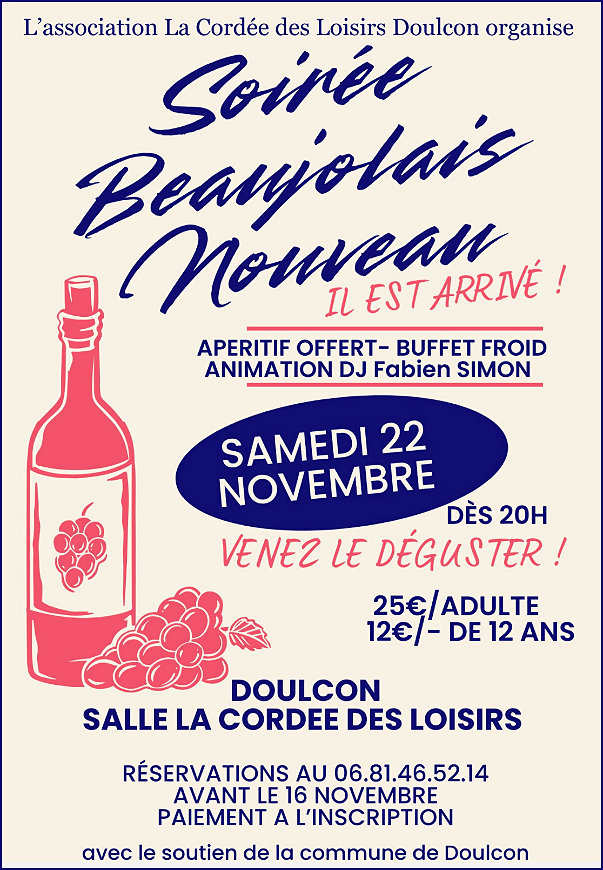 Soirée Beaujolais le 22 novembre à Doulcon.