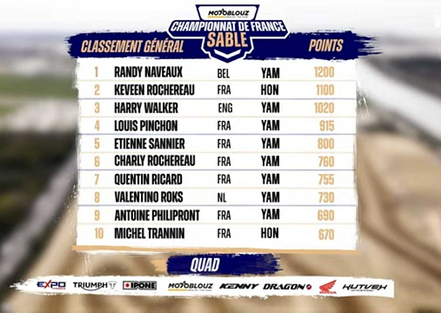 Moulins St-Hubert : Riche actualité du coté du club de Moulins St Hubert en cette fin de saison "terre" et en ce début de la saison hivernale du championnat de France 2026 des course sur sable qui, je le rappelle se déroule à cheval sur 2025 et 2026 avec pour clôturer çà par l'épreuve légendaire du Touquet de plus en plus prisée par les pilotes ! En effet ce n'est jamais moins de 1000 pilotes qui sont au départ de chaque manche (toutes catégories confondues) pour rappel les catégories sont les espoirs (85cc) , les juniors (250cc moins de 17 ans) les motos amateurs et le CFS sans oublier la catégorie "Quads" dominée ces 5 dernières années par Randy Naveaux et aussi Etienne Sannier (5ème) , Thimoté Hieff 15ème , tout 3 pilotes du club local le Mx Moulins Motoclub MX2M ! Vainqueur des 2 premières manches du championnat 2026 de Berck plage et de Loon -Plage c'est avec la plaque rouge de leader du CFS que Randy abordera la prochaine manche de Hossegor - Cap Breton plus déterminé que jamais à récupérer son titre de champion perdu l'an dernier sur un léger soucis mécanique lors de la manche de St Léger de Balzon !
