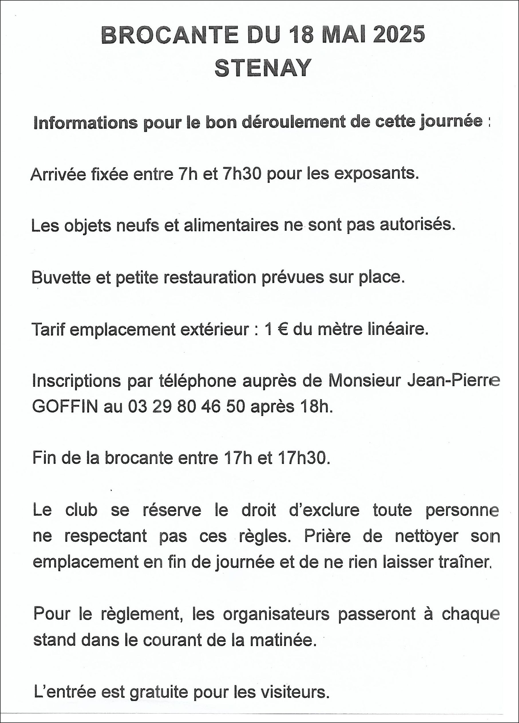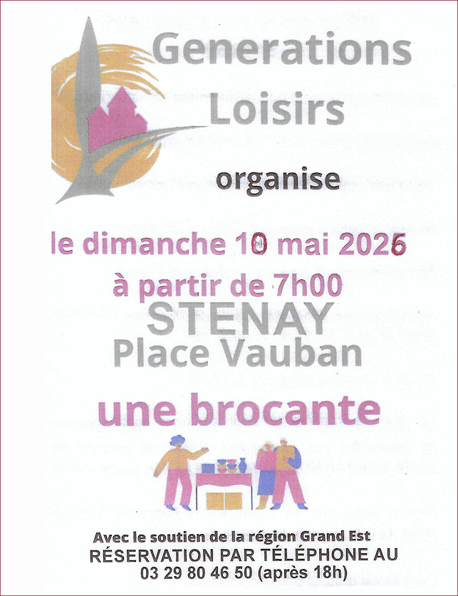 Brocante le 10 mai à Stenay avec le club Générations Loisirs.
