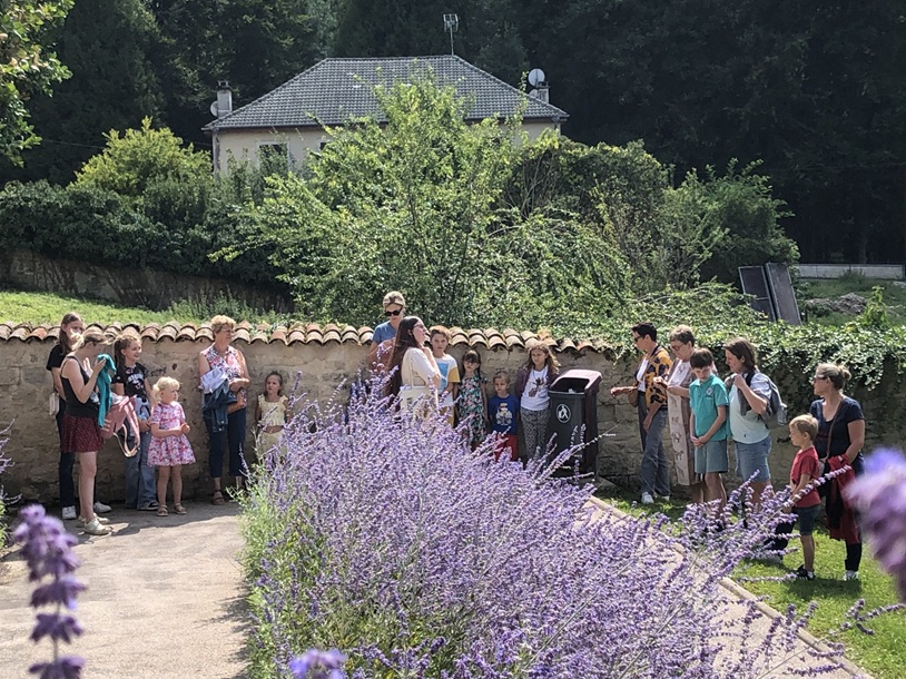 Elyne, médiatrice du musée, en pleine explication dans le jardin.