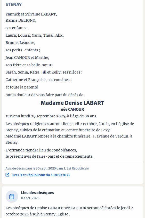 La cérémonie religieuse aura lieu à Stenay le jeudi 2 octobre à 10 heures.