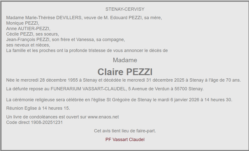 Décès de madame Claire PEZZI