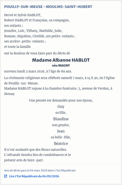 Décédée à Stenay (55700) le lundi 2 mars 2026 à l'âge de 89 ans