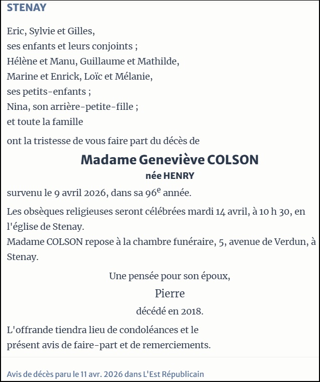 Décédée à Nouzonville (08700) le jeudi 9 avril 2026 à l'âge de 95 ans