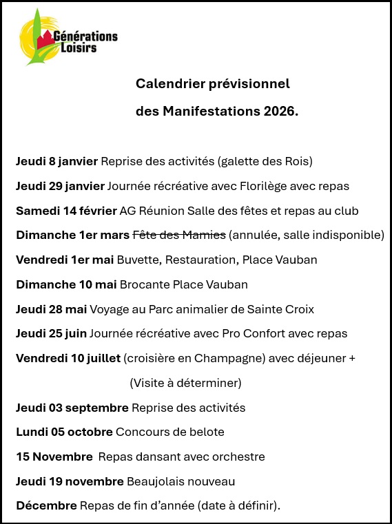 Calendrier des manifestations du club "Générations Loisirs" 2026