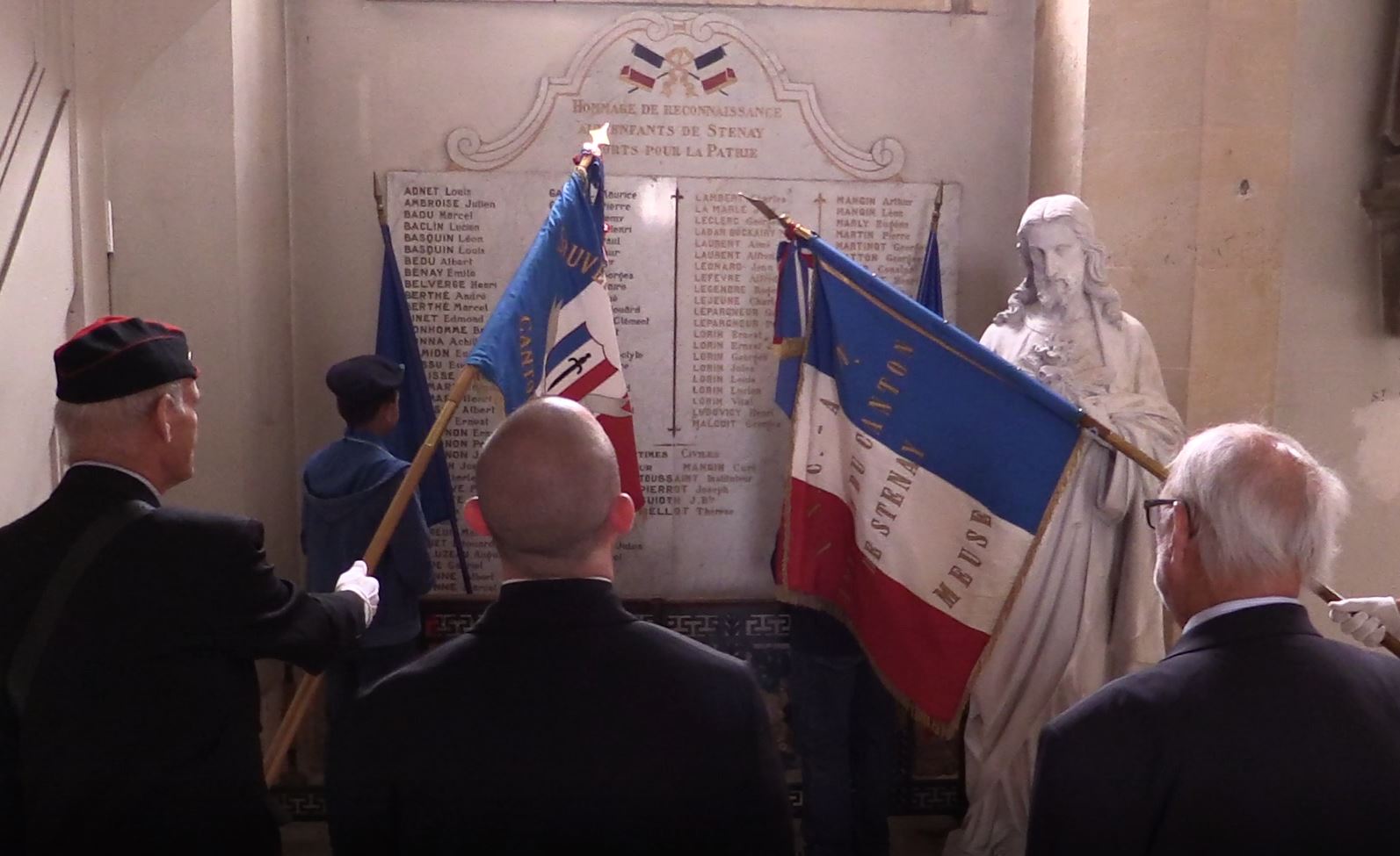 À la fin de la messe, les drapeaux furent déposés au monument situé au fond de l'église, rendant hommage aux enfants de Stenay, morts pour la France.
