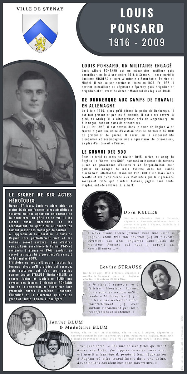 Le maître de cérémonie, Monsieur Cédric SCHWINDT, directeur de l’ONaCVG de la Meuse, après un bref mot d’accueil a donné la parole à Stéphane PERRIN, Maire de Stenay. Ce dernier, dans un discours très structuré a rappelé le parcours militaire de Louis PONSARD, ses actions héroiques pour apporter un peu d’humanité à ces jeunes femmes juives. Alors que la France était libérée « …à RAGHUN aucune liberté, pas de ravitaillement, aucune atténuation de la souffrance pour ces femmes réduites en esclavage ». Stéphane PERRIN a appelé à ne rien oublier et à la nécessité de s’opposer « aux obscurantismes, aux fanatismes, aux nationalismes exacerbés, aux supériorités supposées, aux différenciations tant spécistes que religieuses ».