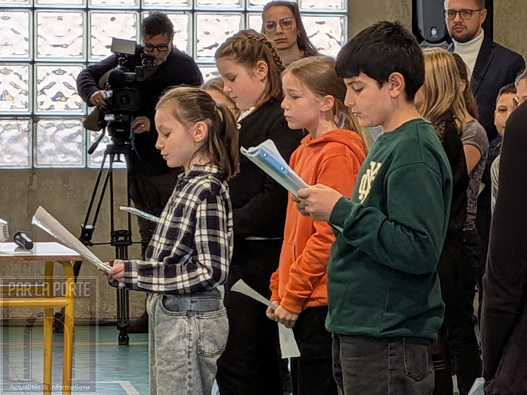 Les élèves de l'école A. Toussaint font lecture du poème intitulé "Le Badge".