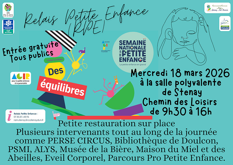 Le Relais Petite Enfance "Pays de Stenay et du Val Dunois" s'associe à ses partenaires pour offrir une journée riche en activités ! Les enfants pourront notamment mettre à l'épreuve leur équilibre avec le Persé Circus, puis gérer leur équilibre émotionnel par le biais d'ateliers menés par le Centre Amy's avant de composer un goûter équilibré avec les professionnelles de la PSMI. Venez découvrir l'ensemble des ateliers proposés tout au long de la journée !