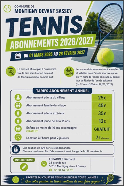 Abonnement tennis à Montigny devant Sassey 2026/2027.