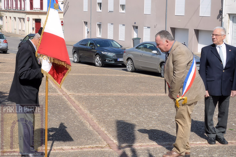 Messieurs Stéphane Perrin, maire de Stenay et Hervé Morel président du Souvenir Français ont déposé une gerbe au pied du monument aux Morts, Place Jules Ferry. Ceux-ci été accompagné de deux porte-drapeaux, d'un côté, M. Georges Baumaux, arborant le drapeau de l'UNC-AFN du canton de Stenay et représentant monsieur Christian Stempert et de l'autre monsieur Michel Clopier, arborant le drapeau du Souvenir Français du canton de Stenay.