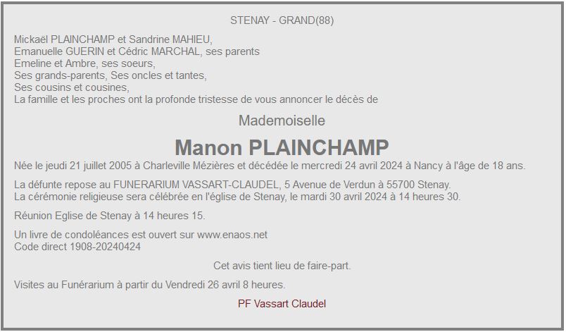 Décès de mademoiselle Manon PLAINCHAMP