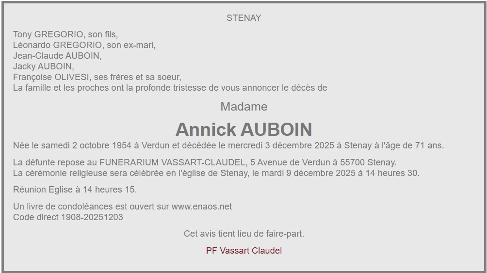 Décédée à Stenay (55700) le mercredi 3 décembre 2025 à l'âge de 71 ans