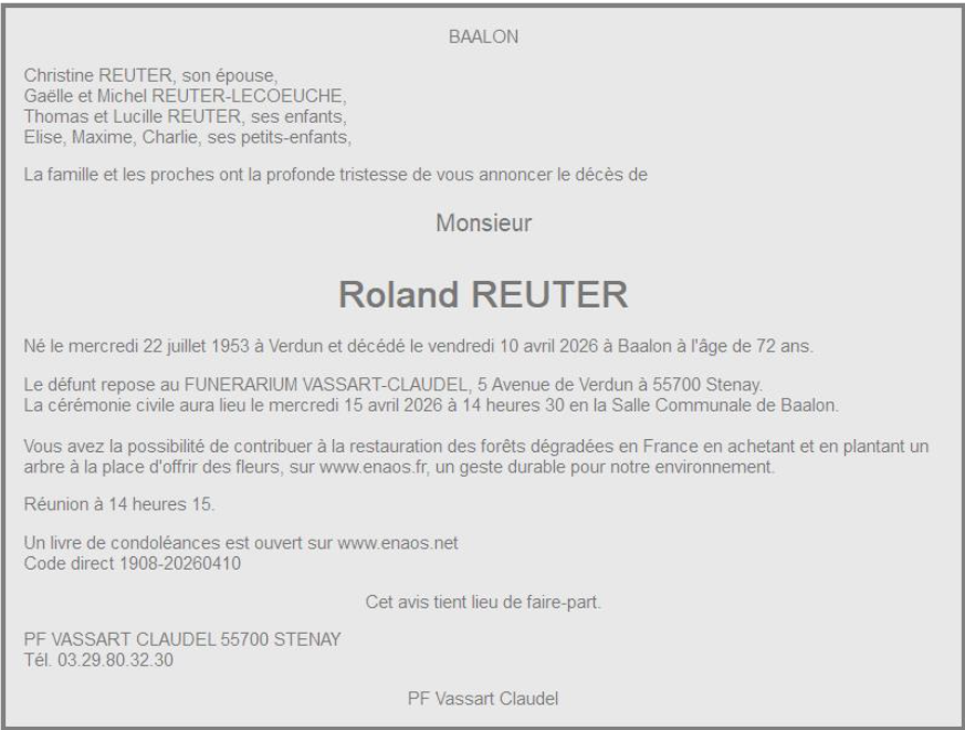 Décédé à Baalon (55700) le vendredi 10 avril 2026 à l'âge de 72 ans